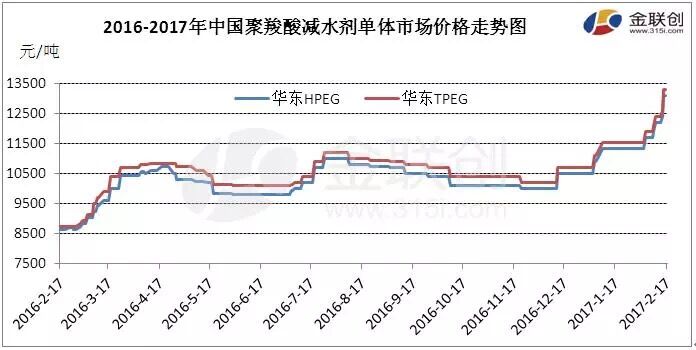 由上圖可見(jiàn),進(jìn)入2017年以來(lái)我國(guó)聚羧酸減水劑單體市場(chǎng)價(jià)格連續(xù)攀漲,整體漲幅達(dá)2600元/噸。截至今日收盤(pán),聚羧酸減水劑單體市場(chǎng)華東地區(qū)TPEG報(bào)盤(pán)參考13200-13400元/噸,HPEG參考13000-13200元/噸;東北地區(qū)TPEG出廠報(bào)盤(pán)參考12700-13000元/噸,HPEG報(bào)盤(pán)參考12500-12800元/噸,實(shí)單成交商談讓利空間有限。